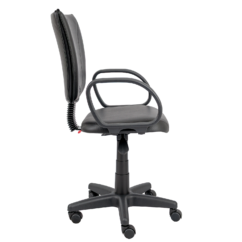 Cadeira giratória com assento em espuma injetada e encosto estofado costurado, oferecendo conforto e suporte lombar. Equipada com base giratória com regulagem de altura e braços fixos modelo Corsa.