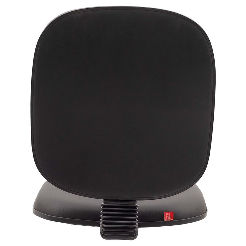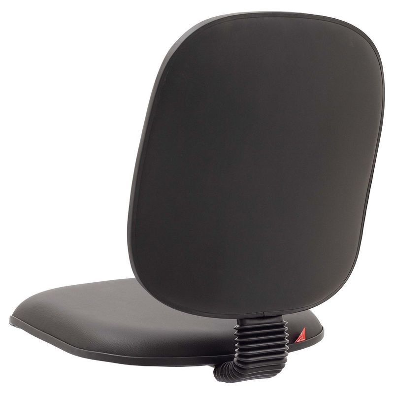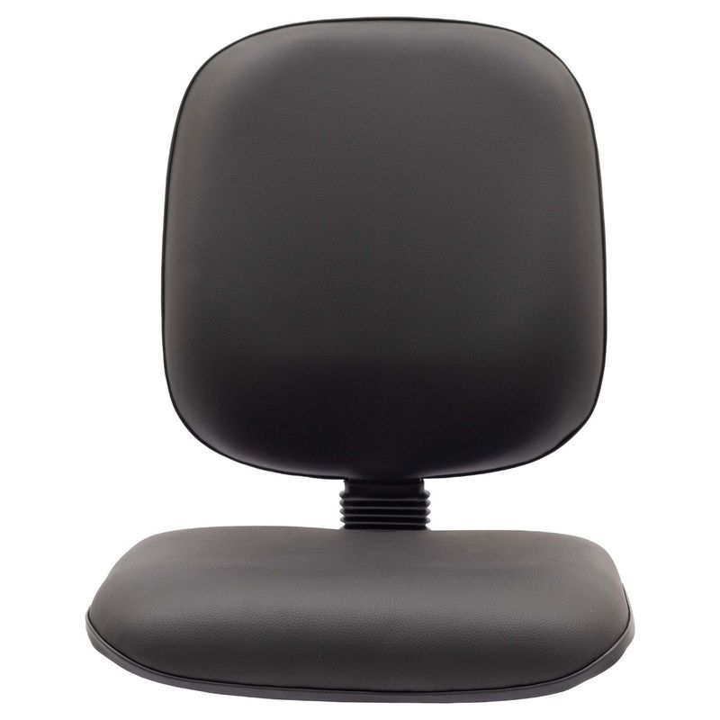 Conjunto assento-encosto confeccionado em oito lâminas de madeira provenientes de florestas renováveis (Pinus/Eucalipto), lâminas com alto grau de dureza, espessura de 1,5 mm por lâmina, moldadas anatomicamente a quente. Espuma flexível de poliuretano injetada anatomicamente, em média com 64 mm de espessura para encosto e 45mm de espessura para assento, com alta densidade (45 a 55 Kg/m³), alto alongamento de ruptura, baixa fadiga dinâmica e baixa deformação permanente. Encosto com saliência para apoio da região lombar do usuário de acordo com a norma NR-17. Revestimento feito em courvin (couro sintético produzido em laminado composto de PVC). Acabamento de proteção das bordas em perfil de PVC. Junção do assento e encosto executada por haste tipo lâmina, dobrada com 100° de curvatura, manufaturada em chapa de aço carbono com espessura de 4,75 mm, provida de vinco externo de reforço estrutural e 80 mm de largura mínima. Dimensões do assento: 480 mm (largura) e 440 mm (profundidade), encosto: 460 mm (largura) e 480 mm (altura). Sistema de fixação do conjunto assento-encosto a base através de parafusos sextavados com 1/4’’ de diâmetro parafusado a porcas garra em aço com acabamento zincado, fixadas a estrutura do assento-encosto.