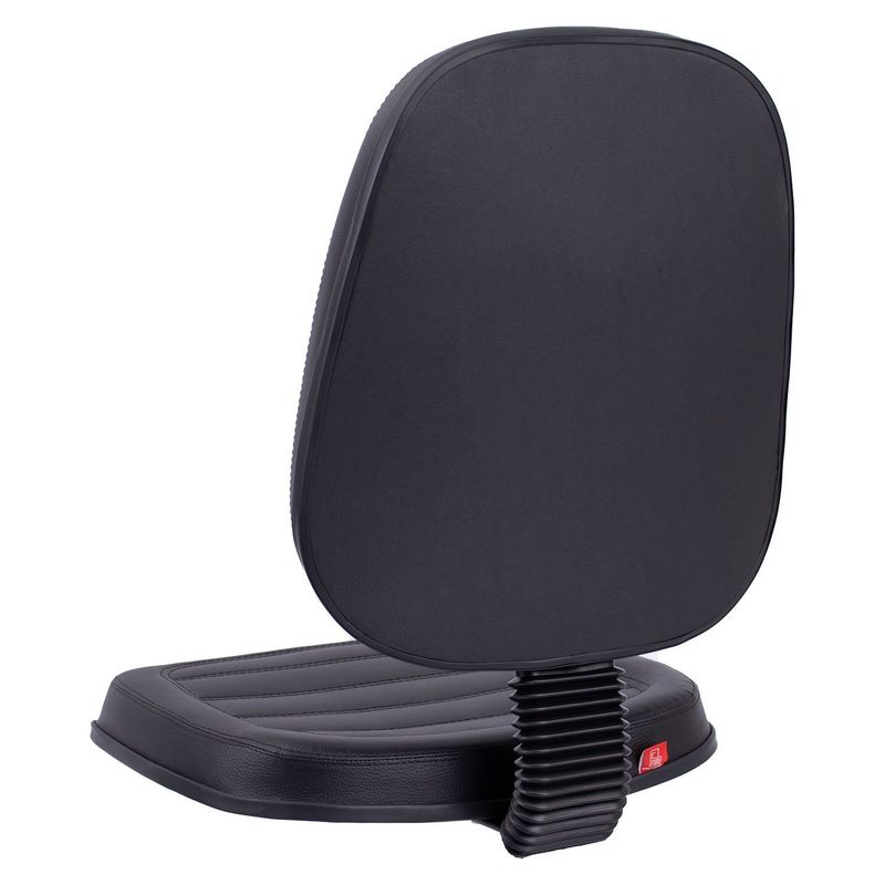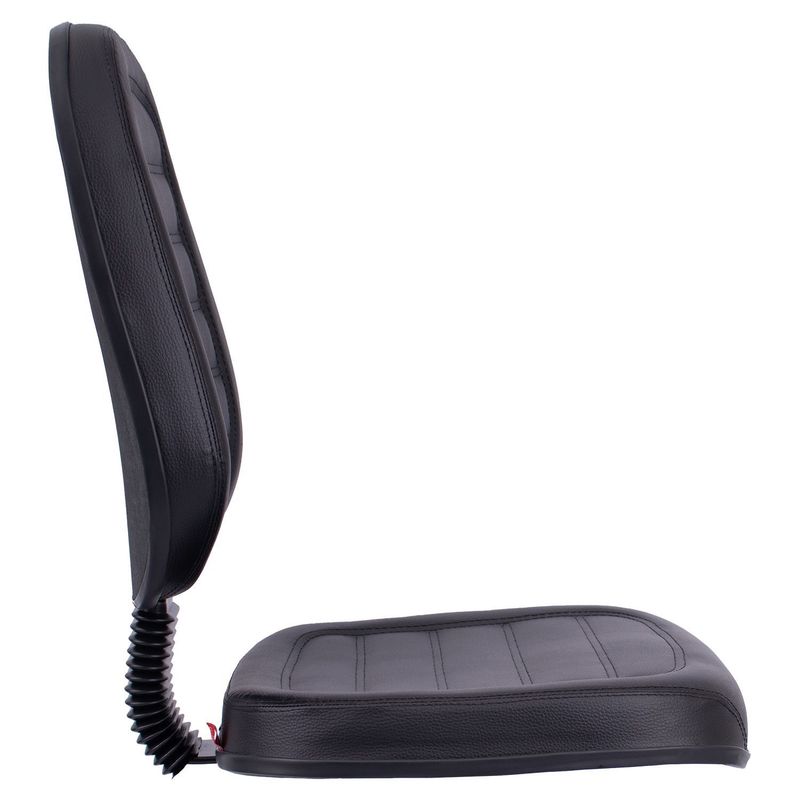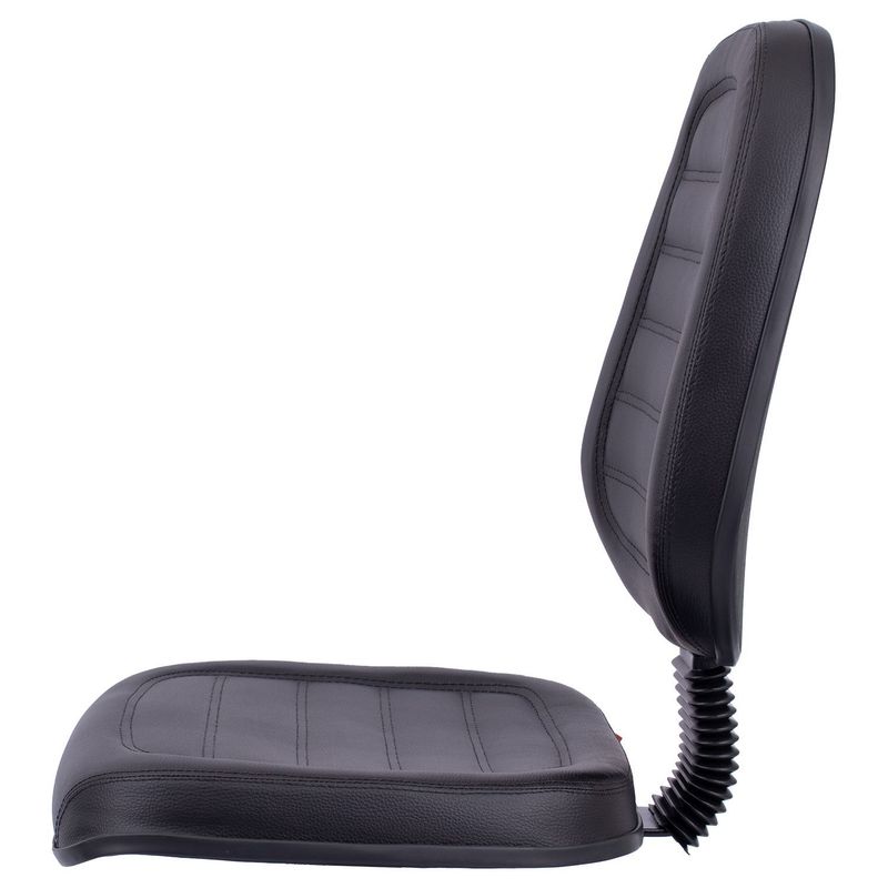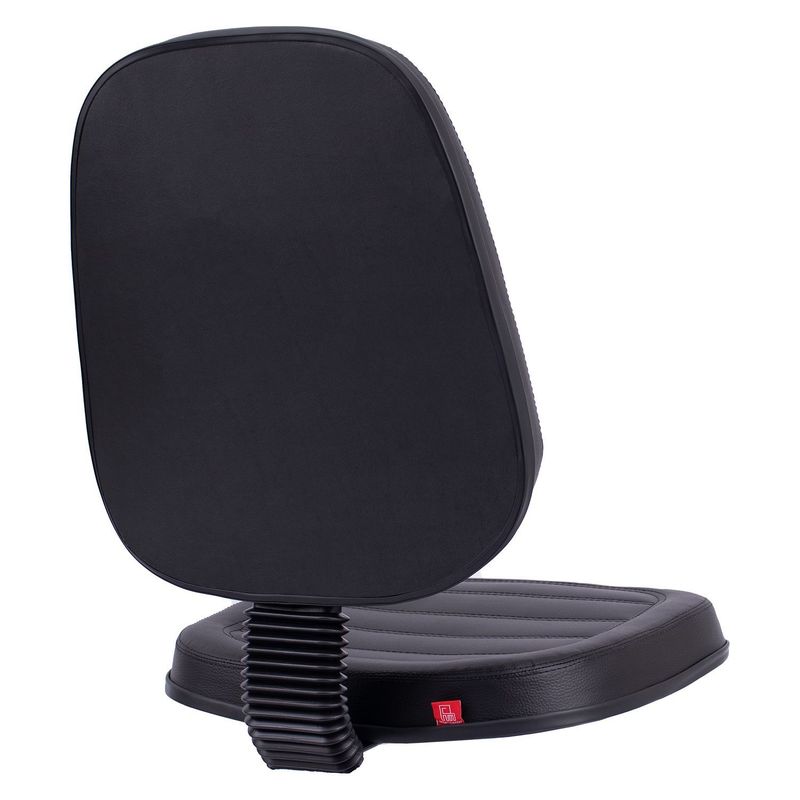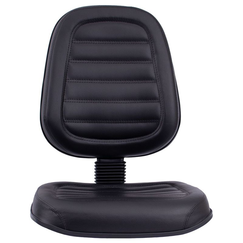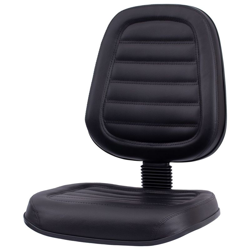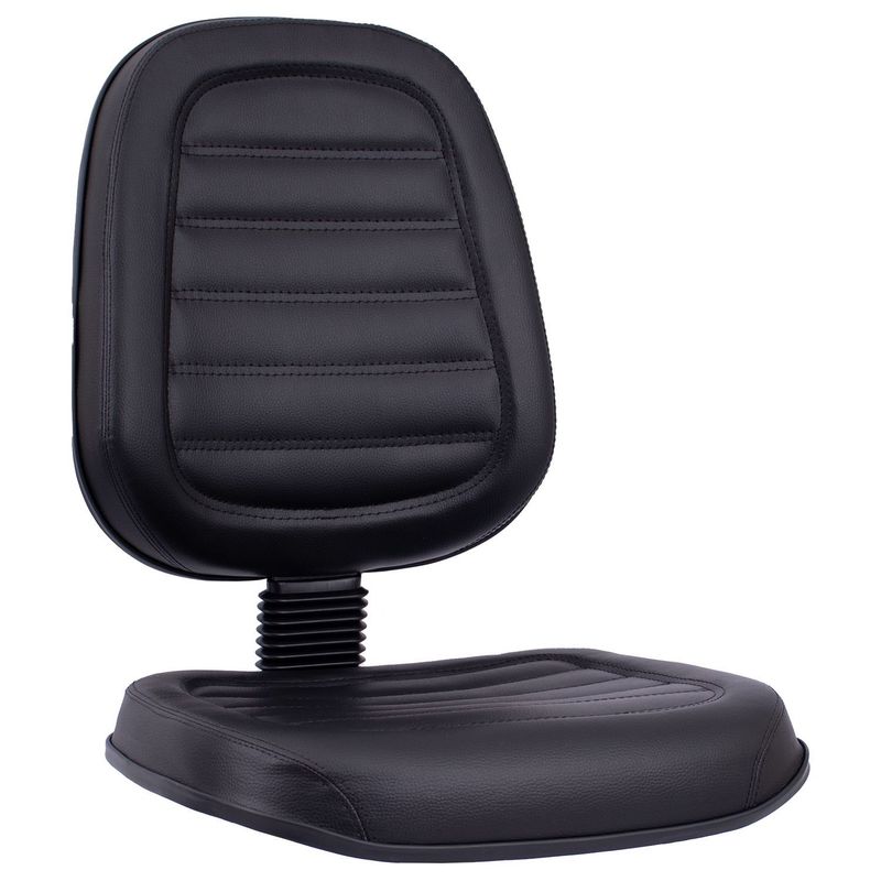 Conjunto assento-encosto confeccionado em oito lâminas de madeira provenientes de florestas renováveis (Pinus/Eucalipto), lâminas com alto grau de dureza, espessura de 1,5mm por lâmina, moldadas anatomicamente a quente. Espuma flexível de poliuretano injetada anatomicamente, em média com 55 mm de espessura para o encosto e 50 mm de espessura para assento, com alta densidade (45 a 55 Kg/m³), alto alongamento de ruptura, baixa fadiga dinâmica e baixa deformação permanente. Encosto com saliência para apoio da região lombar do usuário de acordo com a norma NR-17. Revestimento feito em courvin (couro sintético produzido em laminado composto de PVC), disponível com costura gomada. Acabamento de proteção das bordas em perfil de PVC. Junção do assento e encosto executada por haste tipo lâmina, dobrada com 100° de curvatura, manufaturada em chapa de aço carbono com espessura de 4,75 mm, provida de vinco externo de reforço estrutural e 80 mm de largura mínima. Dimensões do assento: 470 mm (largura) e 440 mm (profundidade), encosto: 420 mm (largura) e 460 mm (altura). Sistema de fixação do conjunto assento-encosto a base através de parafusos sextavados com 1/4’’ de diâmetro parafusado a porcas garra em aço com acabamento zincado, fixadas a estrutura do assento-encosto.