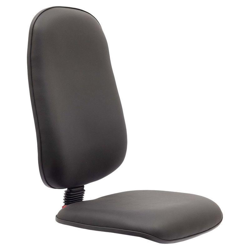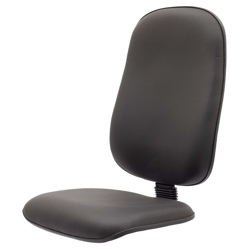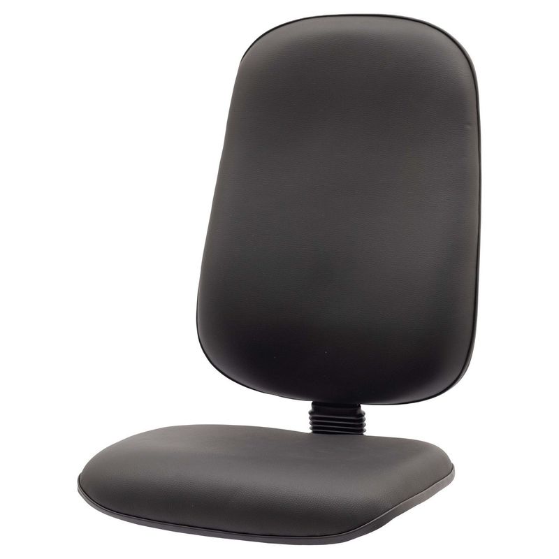 Conjunto assento-encosto confeccionado em oito lâminas de madeira provenientes de florestas renováveis (Pinus/Eucalipto), lâminas com alto grau de dureza, espessura de 1,5mm por lâmina, moldadas anatomicamente a quente. Espuma flexível de poliuretano injetada anatomicamente, em média com 70 mm de espessura para encosto e 45 mm de espessura para o assento, com alta densidade (45 a 55 Kg/m³), alto alongamento de ruptura, baixa fadiga dinâmica e baixa deformação permanente. vestimento feito em courvin (couro sintético produzido em laminado composto de PVC). Acabamento de proteção das bordas em perfil de PVC. Junção do assento e encosto executada por haste tipo lâmina, dobrada com 100° de curvatura, manufaturada em chapa de aço carbono com espessura de 4,75 mm, provida de vinco externo de reforço estrutural e 80 mm de largura mínima. Dimensões do assento: 480 mm (largura) e 440 mm (profundidade), encosto: 465 mm (largura) e 620 mm (altura). Sistema de fixação do conjunto assento-encosto a base através de parafusos sextavados com 1/4’’ de diâmetro parafusado a porcas garra em aço com acabamento zincado, fixadas a estrutura do assento-encosto.