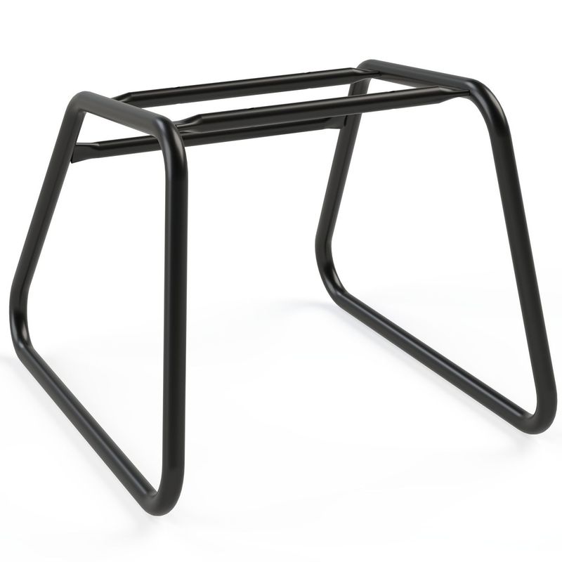 Estrutura metálica manufaturada em tubos redondos em aço carbono ABNT 1020. Pés em forma de trapézio compostos por dois tubos redondos 7/8’’ com espessura de 0,90mm. Suporte dos tubos através de três travessas em tubos redondos, sendo duas com 7/8’’ de diâmetro e espessura de 0,90 mm e outra com 3/4’’ de diâmetro e 0,90mm de espessura. Todas as extremidades dos tubos cobertas por sapatas e ponteiras injetadas em polipropileno (PP). Estrutura metálica soldada em solda MIG inteiriça, sem emendas, sem rugas, dobrada pelo processo de conformação mecânica por dobramento. Todos os componentes metálicos são banhados em agentes químicos (desengraxante, descarbonizante, decapante, fosfatizante, apassivador e neutralizante) para garantir longevidade do material. Superfícies metálicas pintadas em epóxi pó, eletrostática, brilhante, polimerizada em estufa, cor preta.