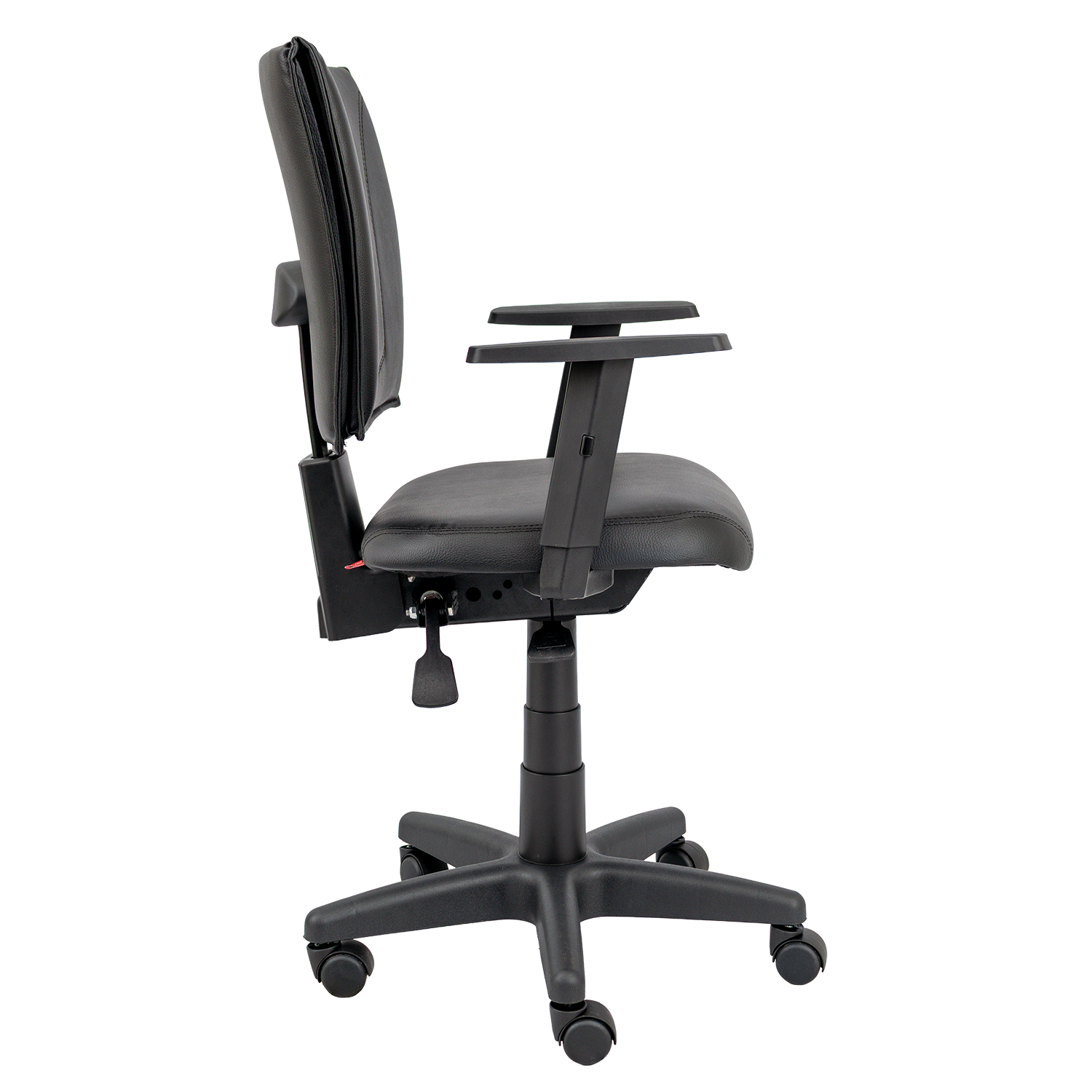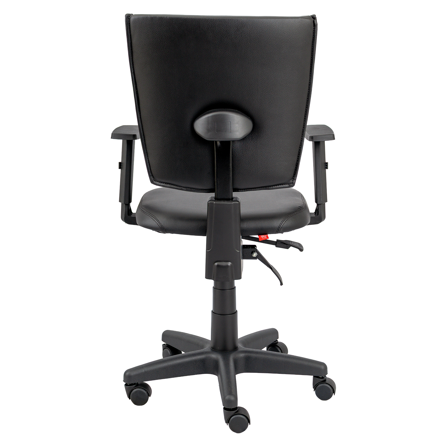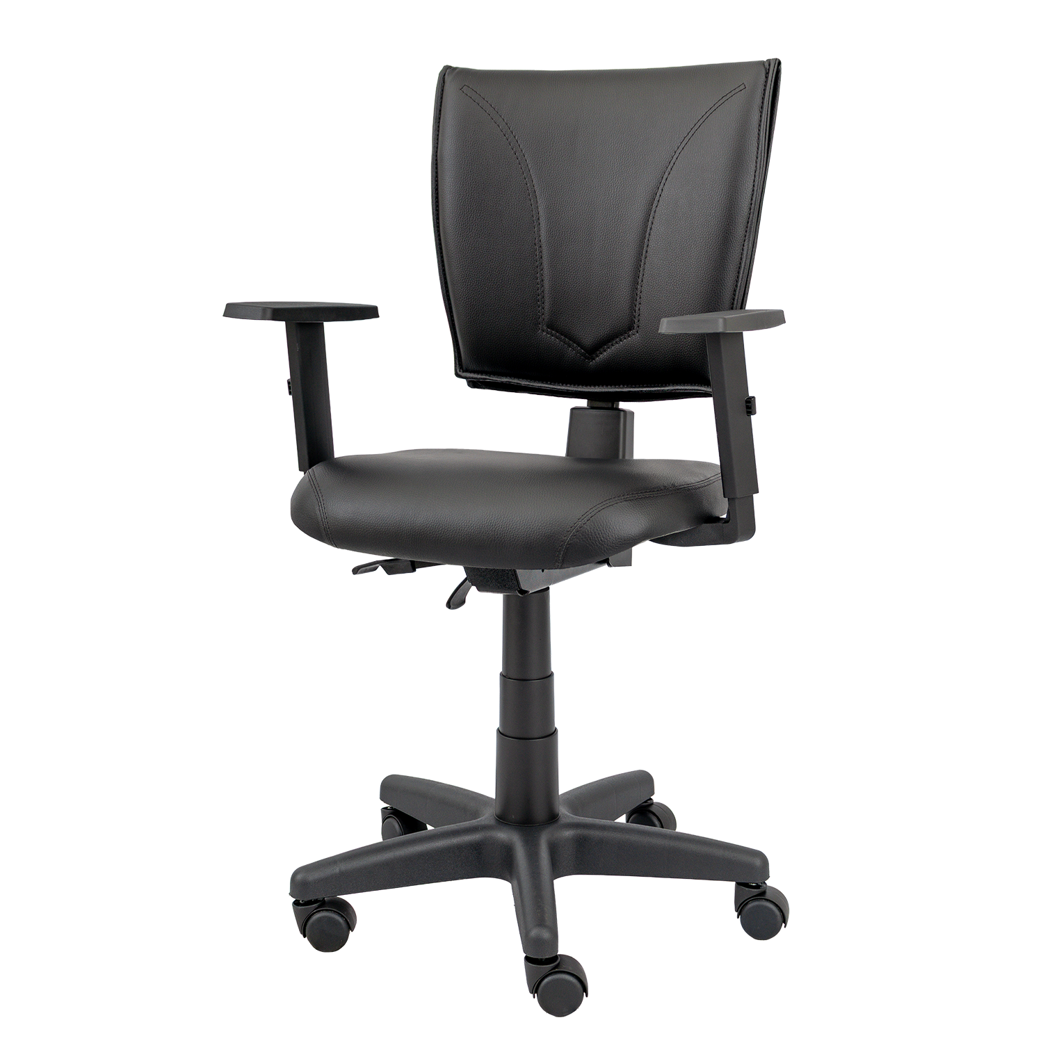 Cadeira giratória com assento em espuma injetada e encosto estofado costurado, oferecendo conforto e suporte lombar. Equipada com base giratória com regulagem de altura e braços reguláveis modelo Six.