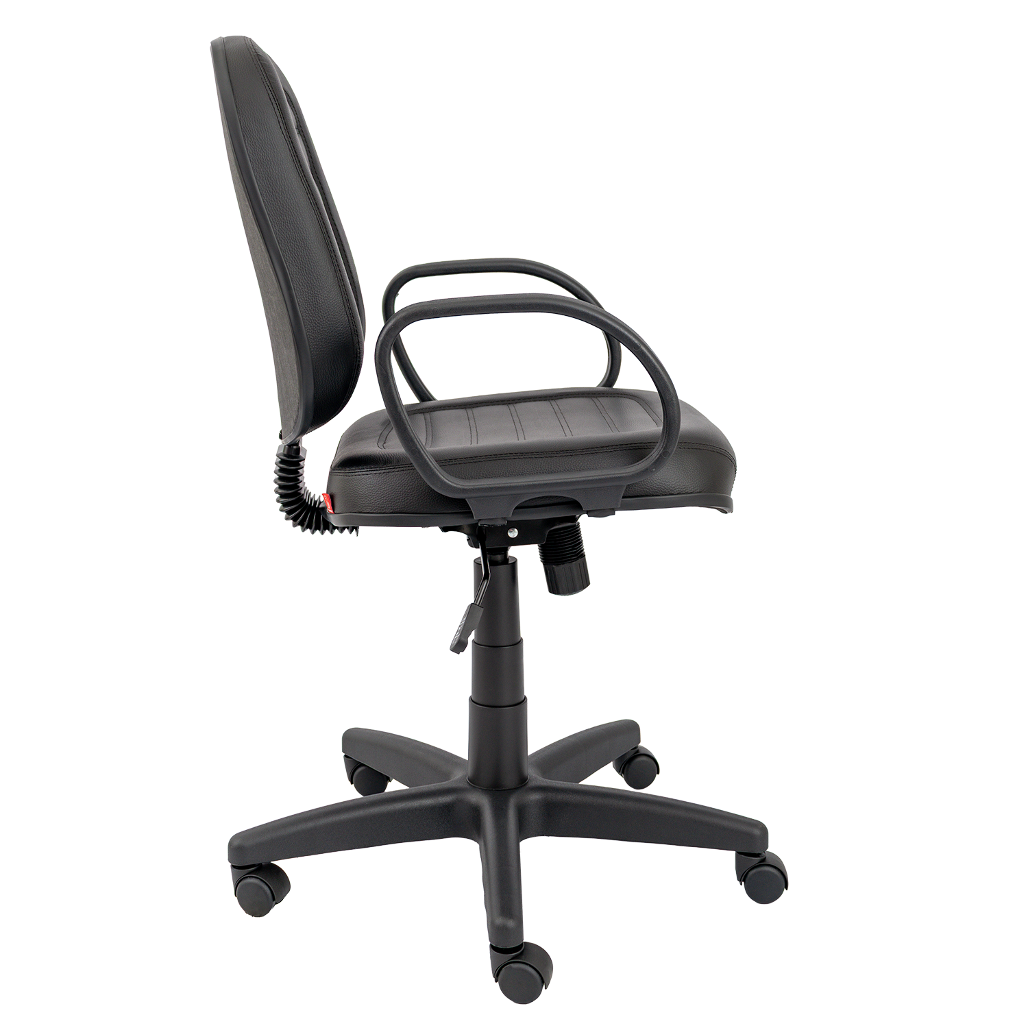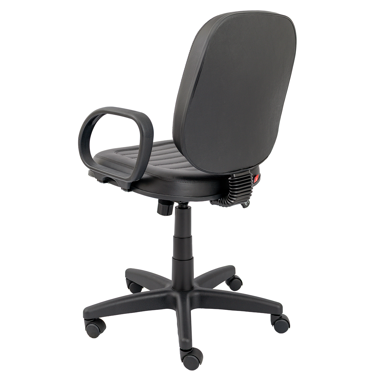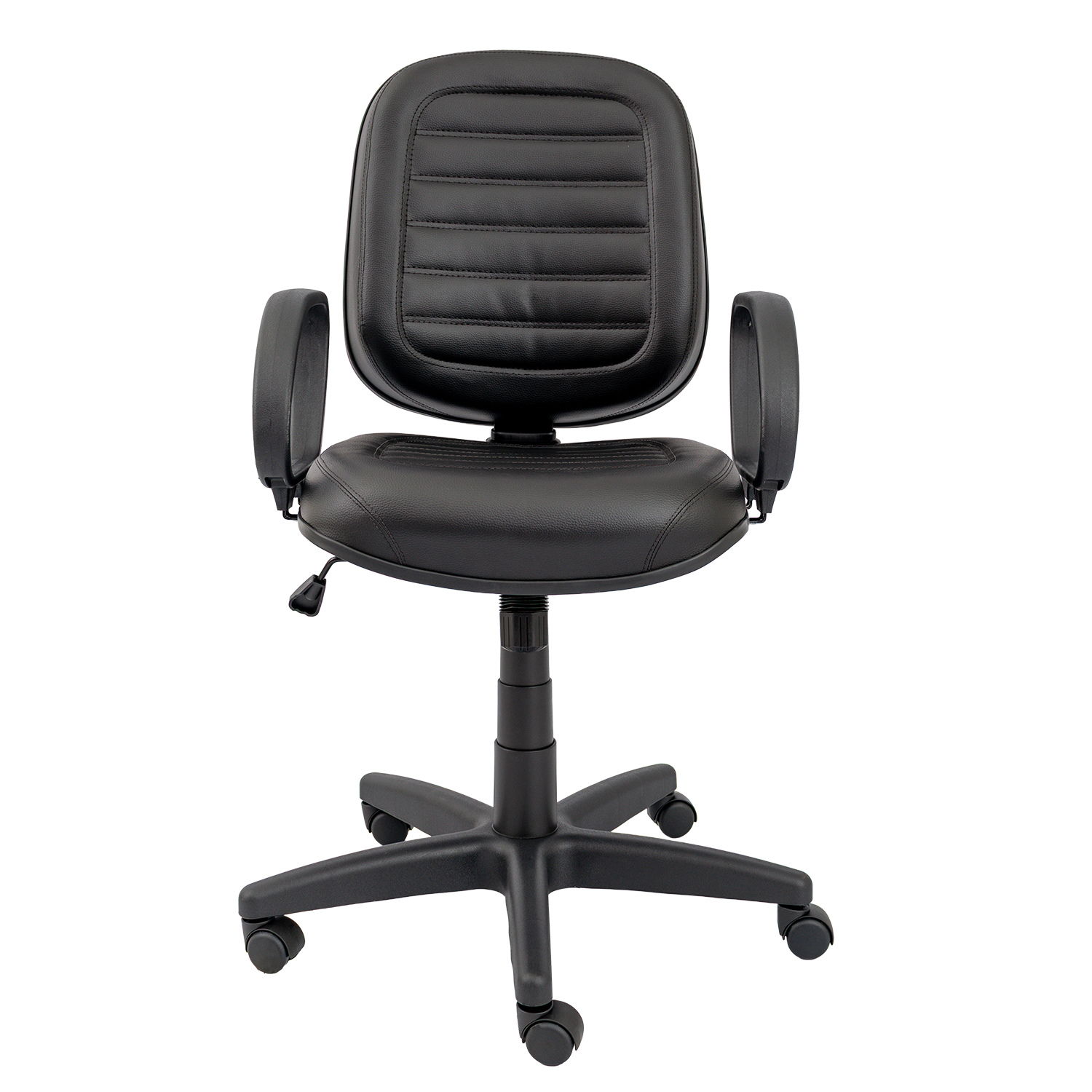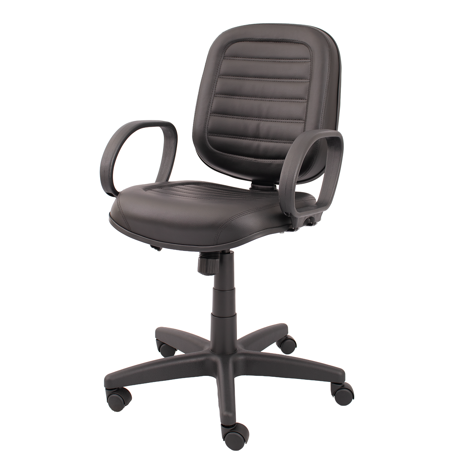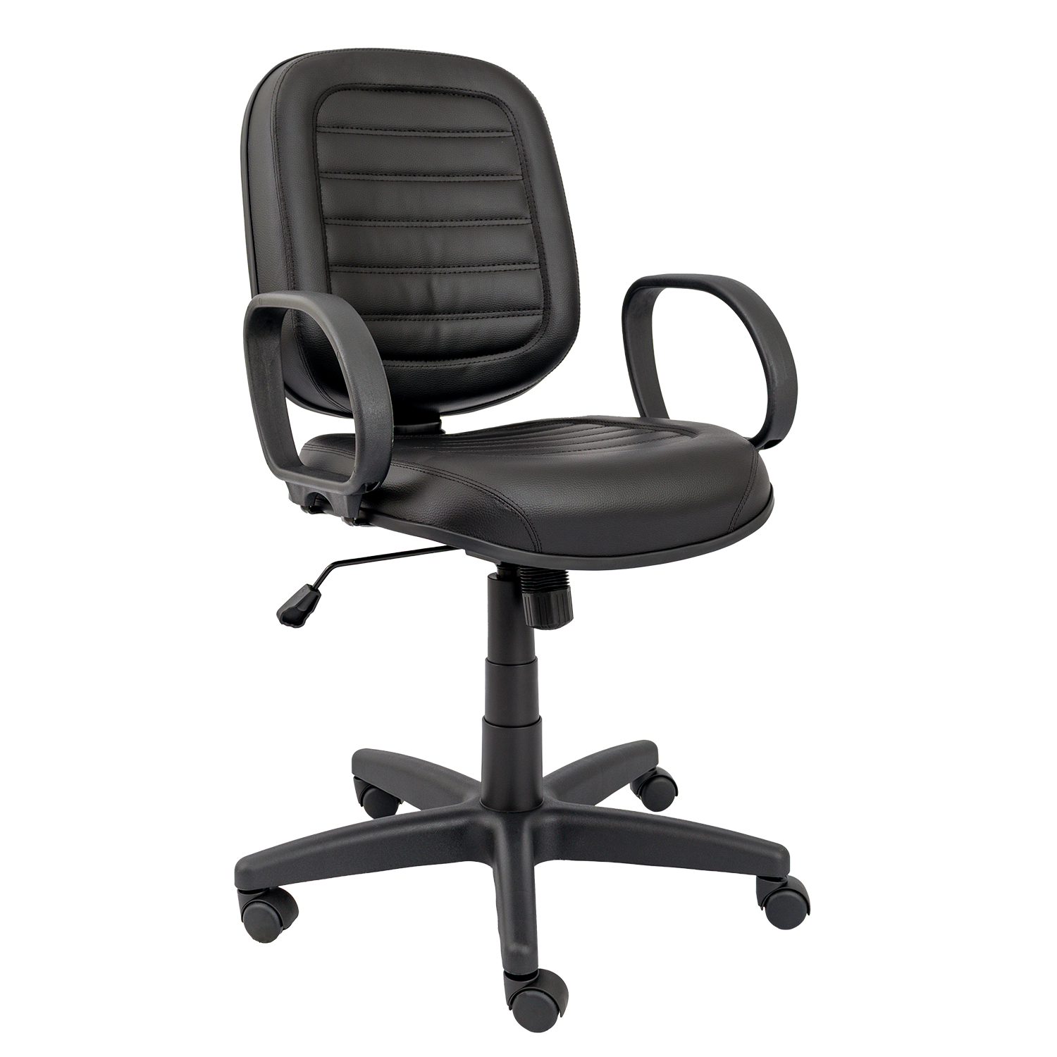 Cadeira diretor giratória com mecanismo relax, permitindo reclinamento simultâneo do assento e encosto com ajuste de tensão. Versão costurada com estofamento de maior espessura, proporcionando maior conforto. Equipada com base giratória com regulagem de altura e braços fixos modelo Corsa.