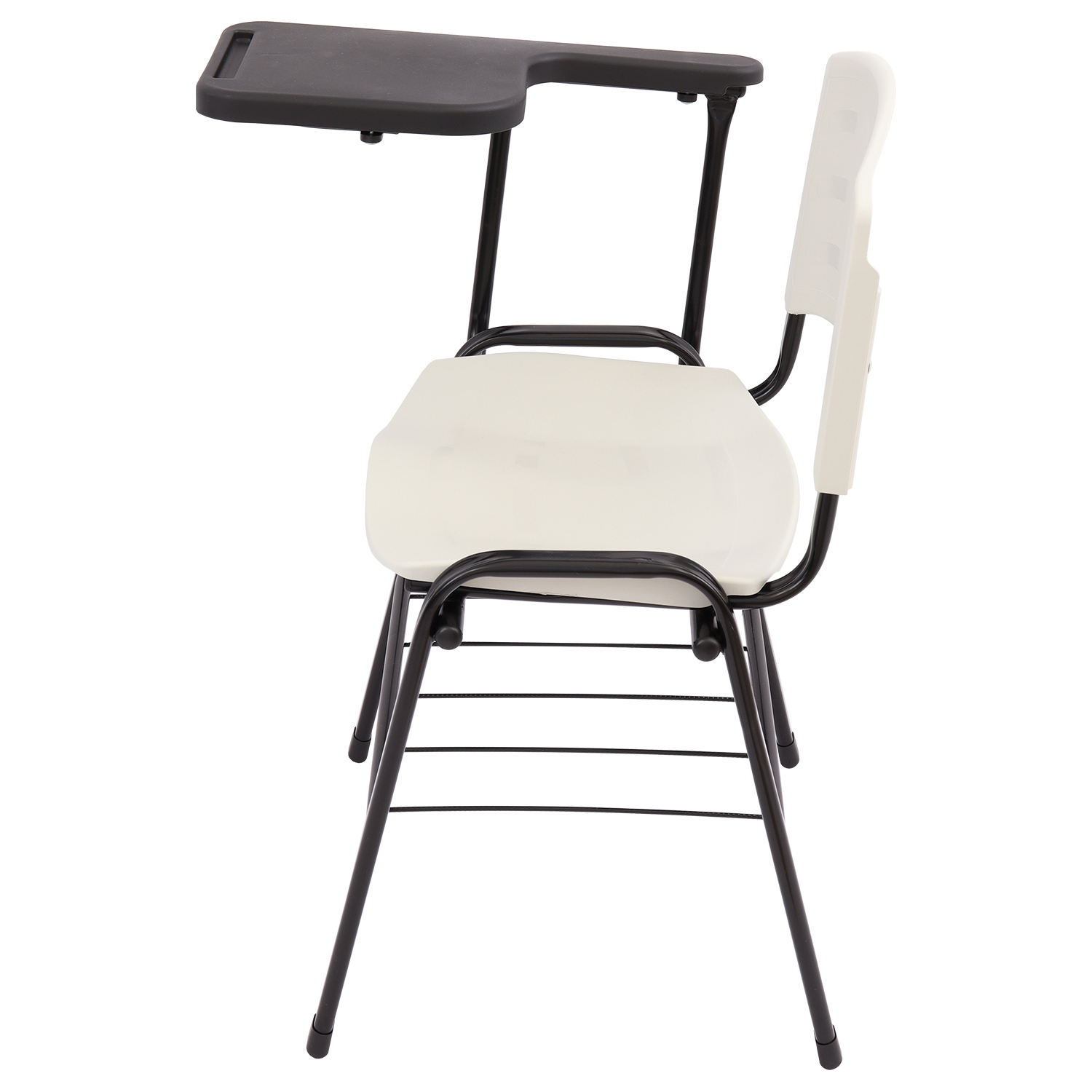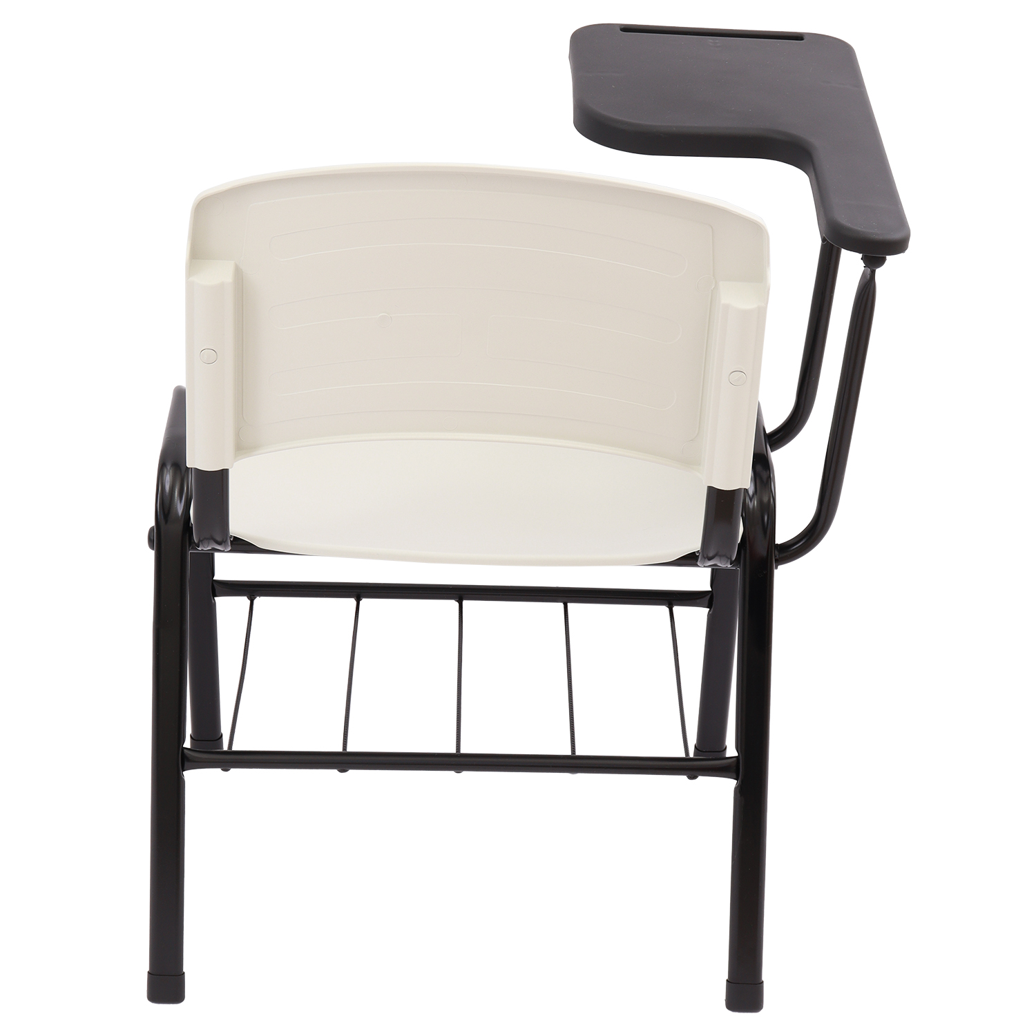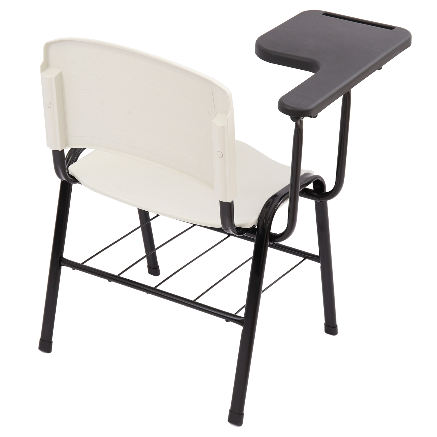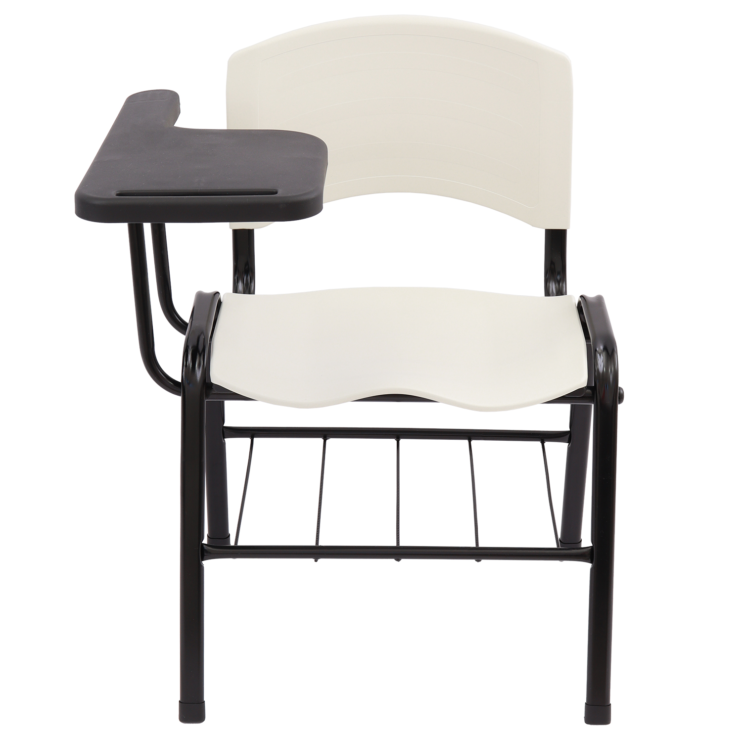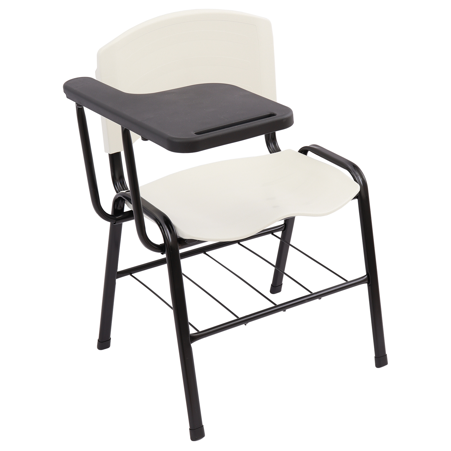 Cadeira universitária com assento e encosto em polipropileno injetado e prancheta lateral plástica, indicada para salas de aula, treinamentos e ambientes educacionais. Possui estrutura metálica reforçada, porta-livros inferior e prancheta ergonômica para destros.