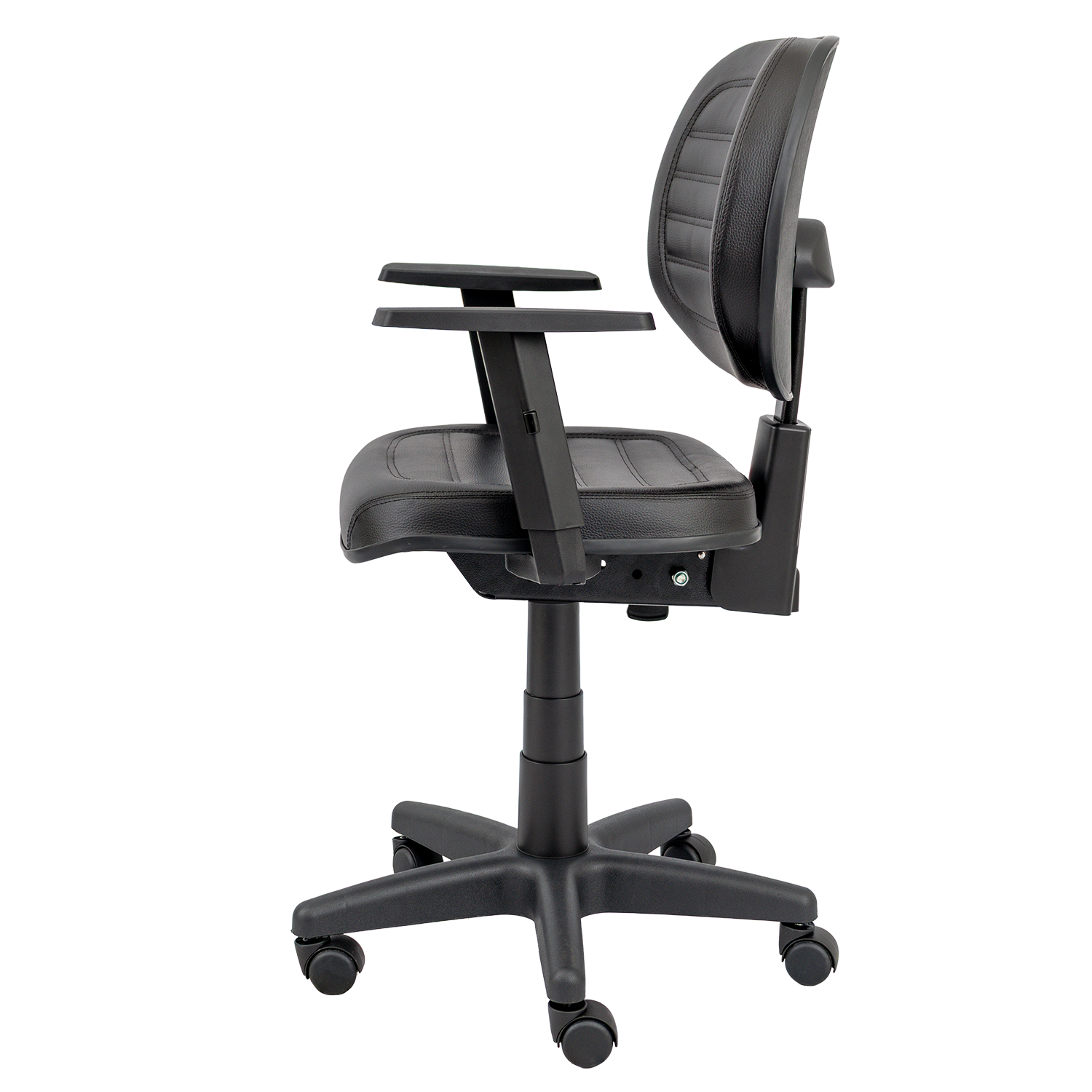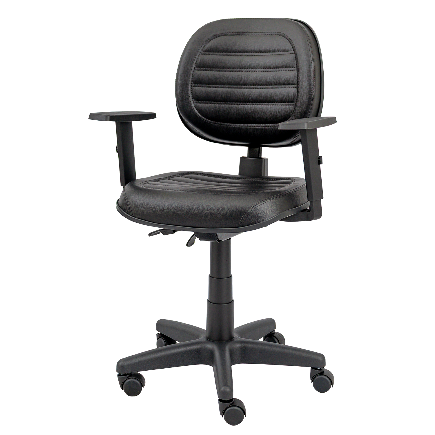 Cadeira executiva giratória com mecanismo back system, regulagem de altura e inclinação do encosto. Possui assento e encosto estofados com espuma injetada e apoio lombar, indicada para ambientes corporativos e escritórios.