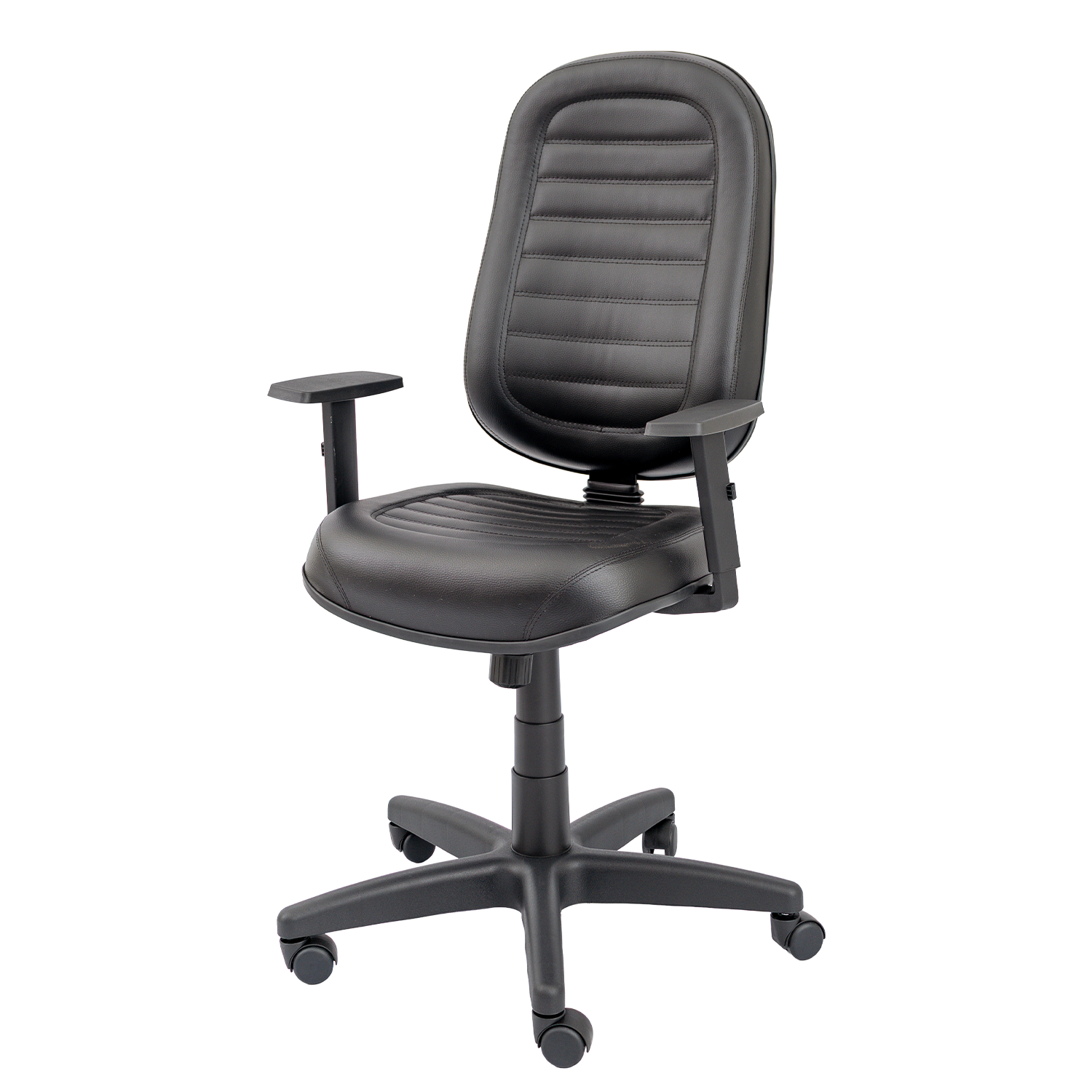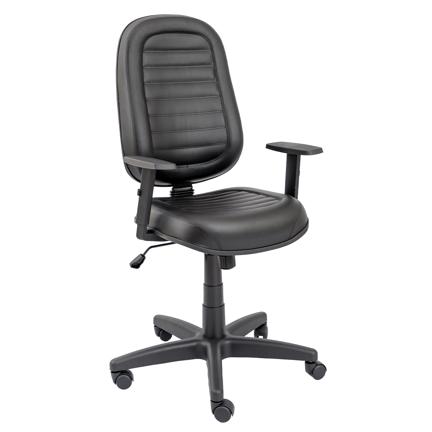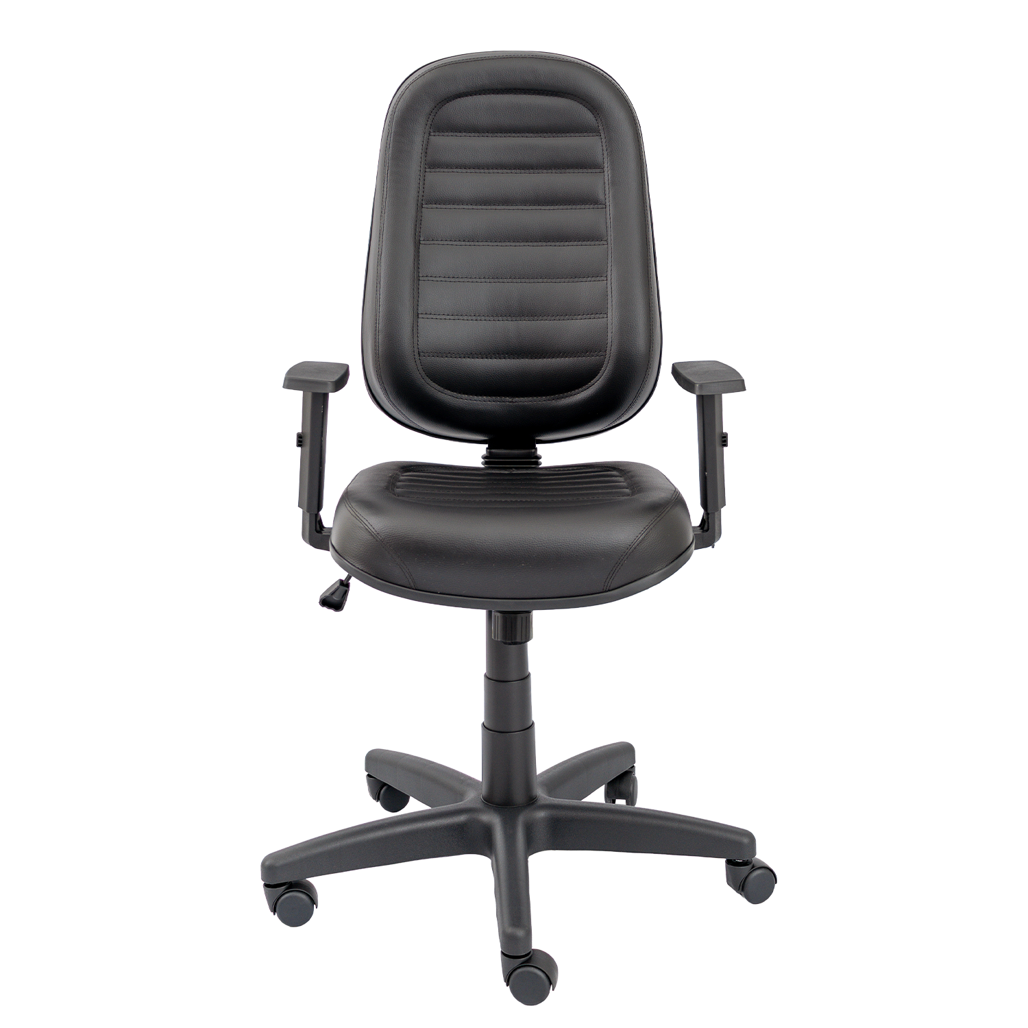 Cadeira presidente giratória com encosto médio, mecanismo relax e estofamento costurado de grande espessura. Possui apoio lombar para maior conforto durante o uso, equipada com base giratória com regulagem de altura e braços reguláveis modelo Six.
