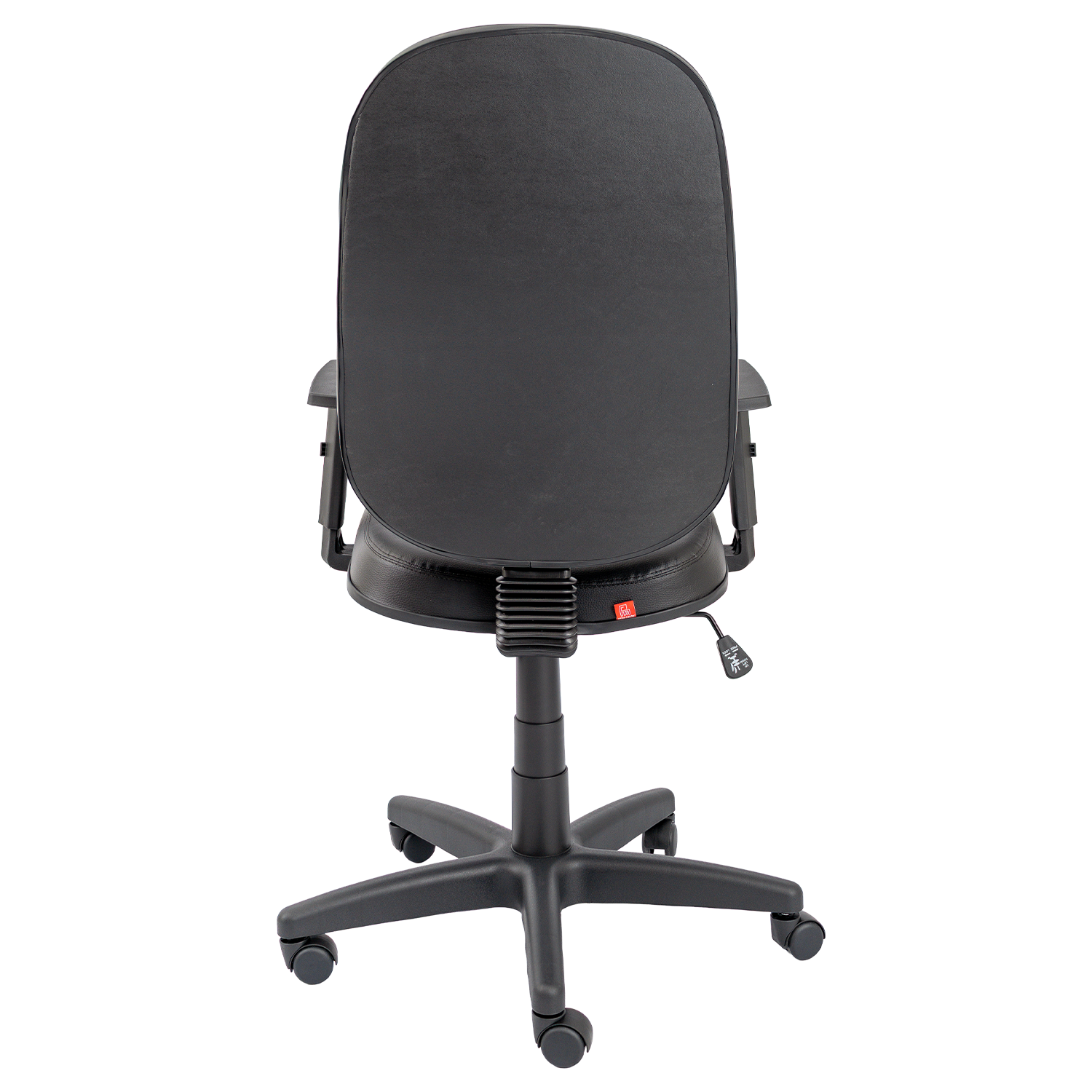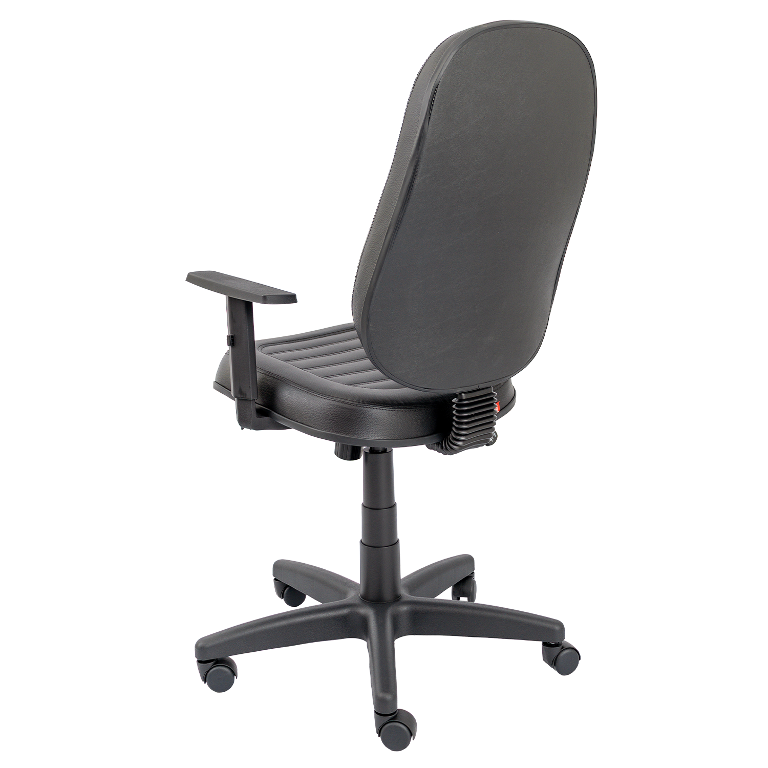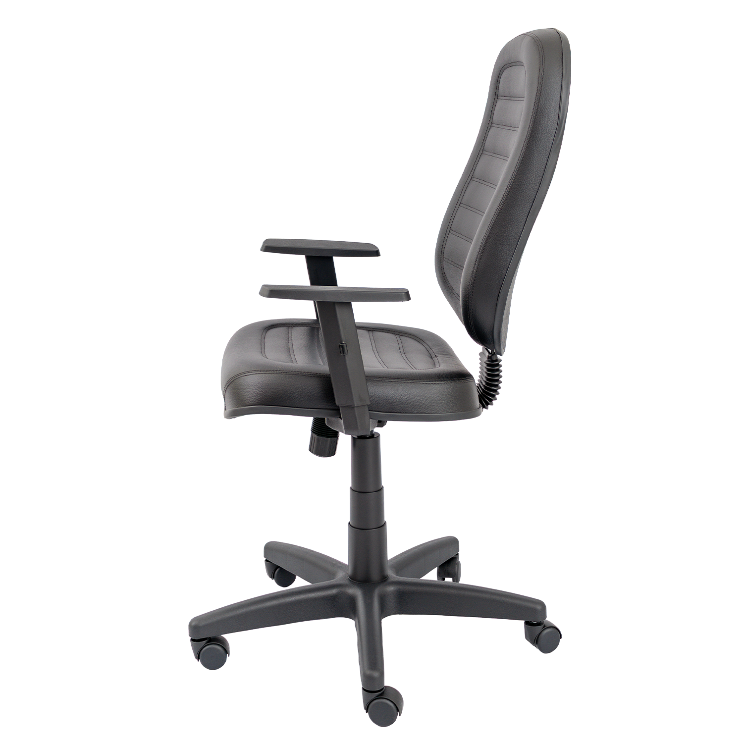 Cadeira presidente giratória com encosto médio, mecanismo relax e estofamento costurado de grande espessura. Possui apoio lombar para maior conforto durante o uso, equipada com base giratória com regulagem de altura e braços reguláveis modelo Six.